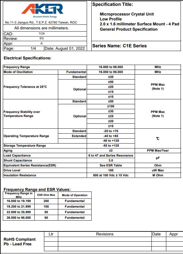 | C1E-32.000-10-1015-X-R | Aker晶振 | C1E | 32 MHz | ±15ppm | ±10ppm | 10pF |