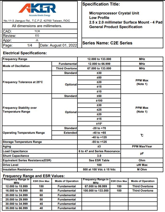 | C2E-12.000-18-1020-X-R | Aker晶振 | C2E | 12 MHz | ±20ppm | ±10ppm | 18pF |