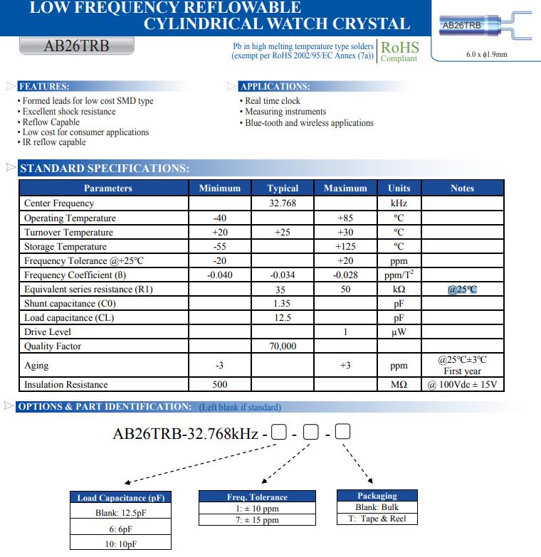 | AB26T-32.768KHZ | Abracon晶振 | AB26T | 32.768kHz | ±20ppm | 12.5pF | -10°C ~ 60°C |