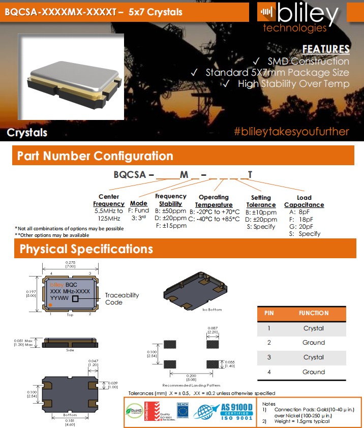 Bliley晶振,6G通訊設備晶振,BQCSA-16.000MF-BCDGT四腳晶振,美國Bliley晶振公司,貼片晶振,石英晶振,6G物聯網晶振,高精度儀器晶振,高品質晶振,7050晶振,四腳晶振,以太網晶振,無源晶振,SMD封裝,標準5X7mm包裝尺寸,高溫下高穩定性