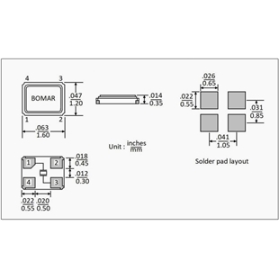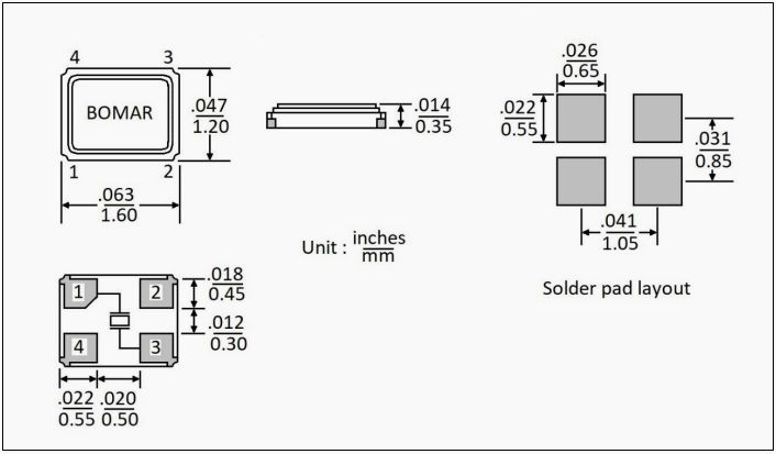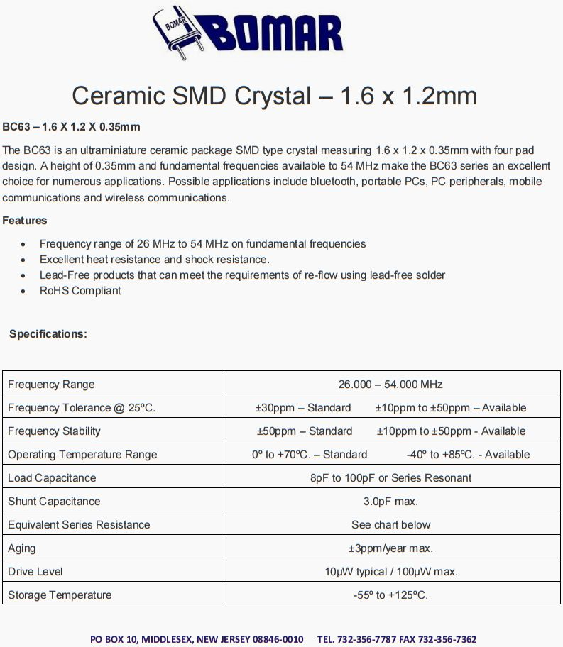 Bomar無源晶振,BC41EFD120-37.400000四腳晶振,無人機信號接收器晶振,美國Bomar晶振公司,進口晶振,歐美晶振,BC63晶振,1612晶振,石英晶振,超小型晶振,無源晶振,貼片晶振,四腳晶振,6G路由器晶振,6G通訊設(shè)備晶振,BC63是一款尺寸為1.6 x 1.2 x 0.35mm的超微型陶瓷封裝SMD型晶體,采用四焊片設(shè)計。0.35mm的高度和54 MHz的基頻使BC63系列成為眾多應(yīng)用的絕佳選擇。可能的應(yīng)用包括藍(lán)牙、便攜式個人電腦、個人電腦外圍設(shè)備、移動通信和無線通信