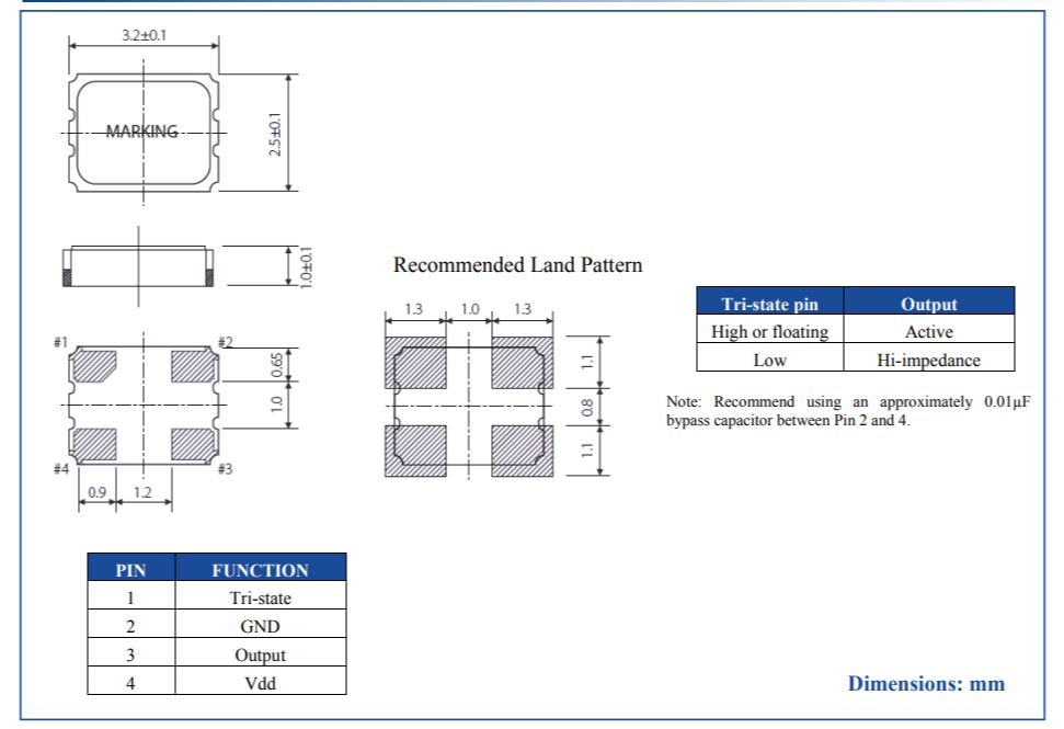 Size/Dimension尺寸 3.2 x 2.5 x 1.0mm 最小包裝數MPQ: 1000