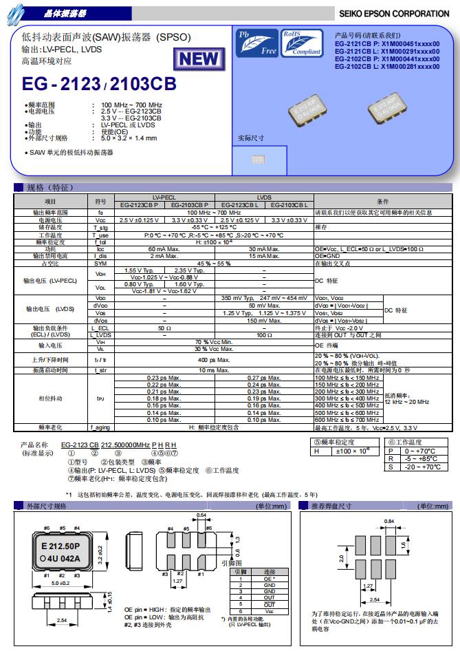 EG-2103CB220.000000MHzLHRH,6G模塊差分晶振,愛(ài)普生進(jìn)口晶振,EG-2103CB有源晶振,EG-2103CB220.000000MHzLHRH晶振,愛(ài)普生進(jìn)口晶振,石英晶體振蕩器,頻率220MHz,電壓3.3V,頻率穩(wěn)定性100ppm,工作溫度-5~85°C,LVDS輸出晶振,6G模塊差分晶振,低抖動(dòng)晶振,無(wú)線通信設(shè)備晶振,網(wǎng)絡(luò)交換機(jī)晶振,SATA晶振,電信交換機(jī)晶振.