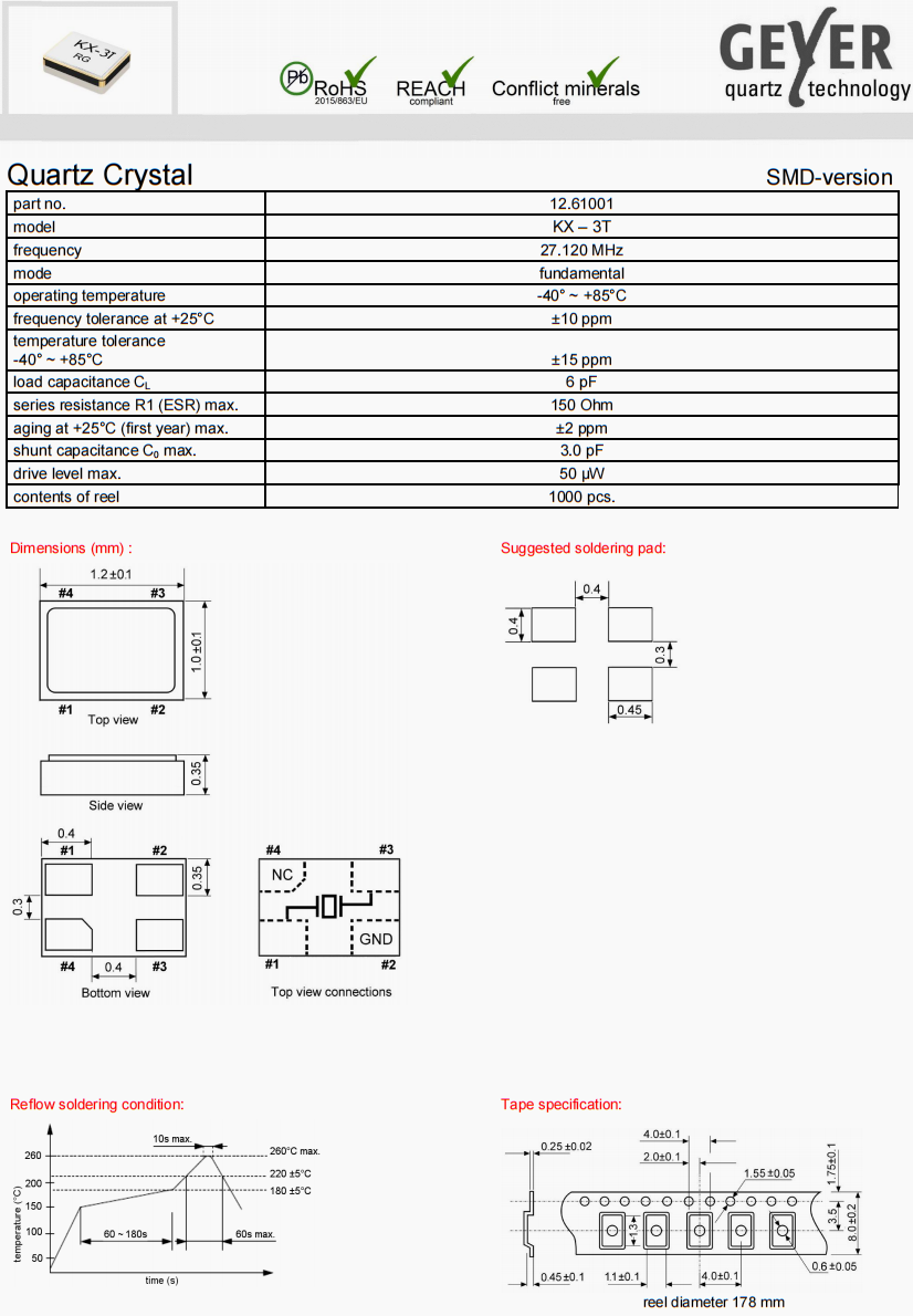 | 12.60024 | Geyer晶振 | KX-7E | 27 MHz | ±100ppm | ±30ppm | 12pF |
