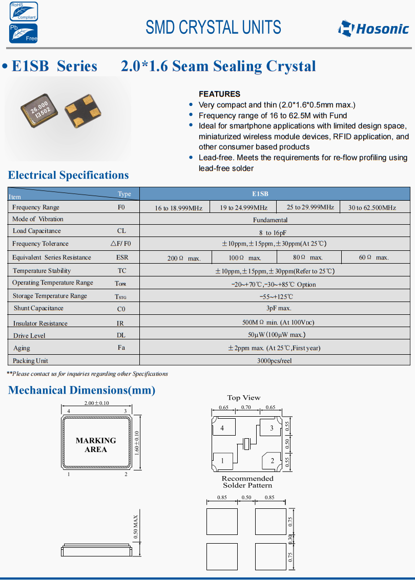 臺(tái)產(chǎn)鴻星晶振,E1SB16E000004E晶振,遙遙領(lǐng)先的6G路由器晶振,臺(tái)灣鴻星晶振公司,特點(diǎn):非常緊湊,非常薄(最大2.0 *1.6*0.5mm),頻率范圍為16至62.5M,非常適合設(shè)計(jì)空間有限的智能手機(jī)應(yīng)用,小型化無線模塊設(shè)備,RFID應(yīng)用和其他消費(fèi)類產(chǎn)品。滿足使用無鉛焊料的回流剖面要求。無源晶振,貼片晶振,小尺寸晶振,2016晶振,環(huán)保無鉛晶振,高精度晶振,無人機(jī)高清攝像模塊晶振,北斗衛(wèi)星定位模塊晶振。