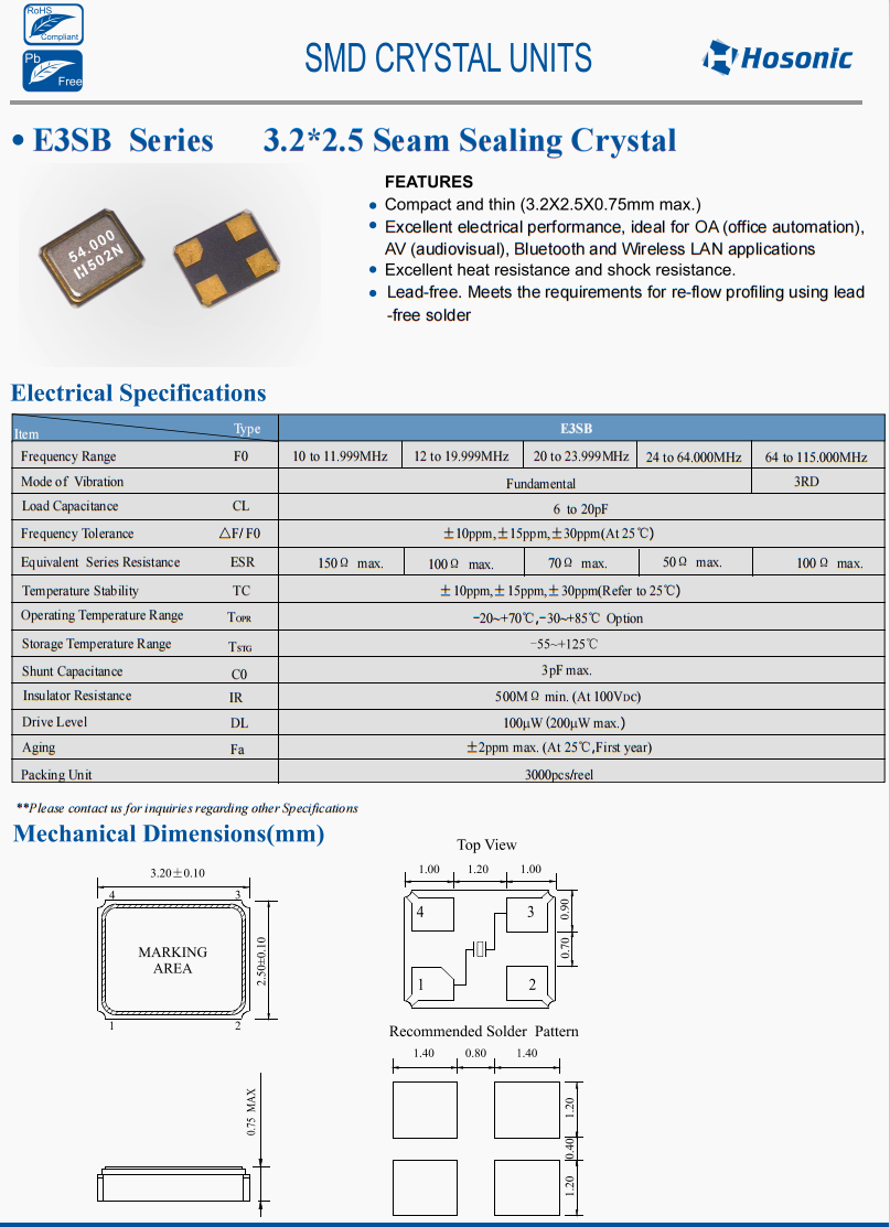 | E3SB40E00001BE | Hosonic晶振 | E3SB | 40 MHz | ±10ppm | ±10ppm | 15pF | -30°C ~ 85°C |
