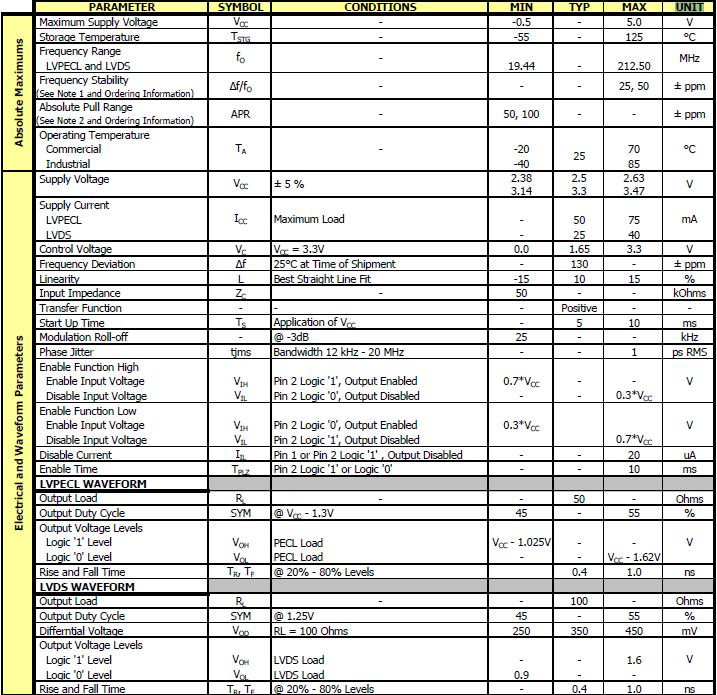 美國CTS晶振335的工作條件如下:最大的電源電壓VCC - -0.5 - 5.0 V,儲存溫度測試- -55 - 125°C,頻率范圍:LVPECL和LVDS 19.44 - 212.50,頻率穩定度,控制電壓VC VCC = 3.3 V 0.0 1.65 3.3 V,在裝運時間頻率偏移Δf 25°C - 130±ppm,L線性最佳直線符合-15年10 15%,輸出工作周期對稱@ 1.25 v 45 - 55%,差動電壓VOD RL = 100歐姆250 350 450 mV,上升和下降時間TR,TF - 0.4 - 1.0 ns @ 20% - 80%的水平