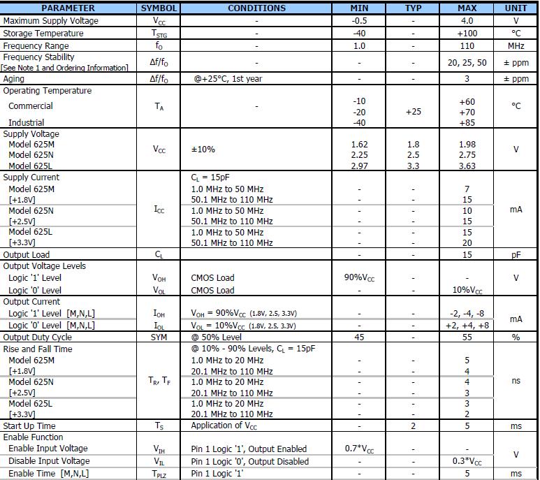 CTS石英晶振Model625,石英晶體振蕩器2520mm,標準2.5毫米x 2.0毫米4-Pad表面安裝包,HCMOS輸出,基本和第三泛音晶體的設計,頻率范圍1 - 110 MHz,頻率穩定度±50 ppm標準,±25 ppm和±20 ppm,操作電壓+ 1.8 vdc,+ 2.5 vdc或+ 3.3伏直流,操作溫度為-40°C + 85°C,允許輸出標準,磁帶和卷軸包裝標準,eia - 418,符合RoHS .
