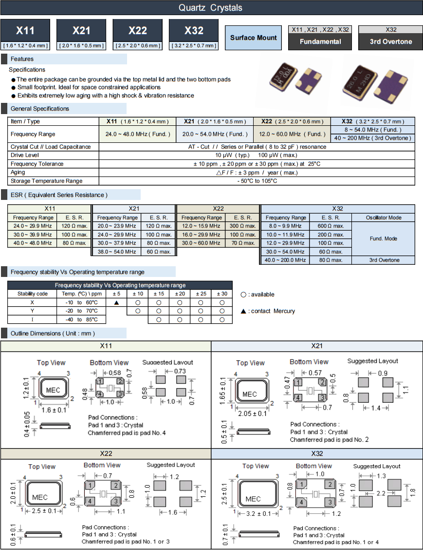 臺灣MERCURY晶振,X21-12.000-18-20/20X/20R無源晶振,臺灣瑪居禮晶振公司,高品質晶振,無源晶振,小尺寸晶振,四腳晶振,2016晶振,石英晶振,6G通訊設備晶振,智能手機基站,智能手表晶振,貼片晶振,整個封裝可以通過頂部的金屬蓋和底部的兩個襯墊接地,小的封裝,理想的空間限制應用,具有極低的老化和高的抗沖擊和抗振動性能