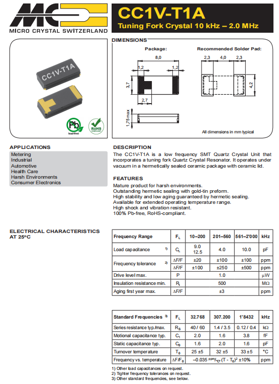 CC1V-T1A-32.768kHz-12.5pF-30PPM-TA-QC,瑞士微晶進(jìn)口晶振,8037mm 特點(diǎn):