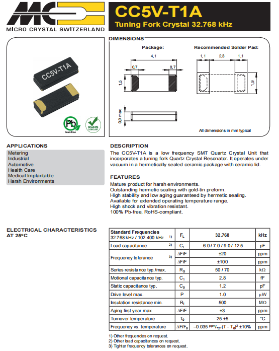 1.CC5V-T1A是一種低頻SMT石英晶體單元結(jié)合了一個音叉石英晶體諧振器,它在真空環(huán)境下工作,采用密封陶瓷包裝與陶瓷蓋