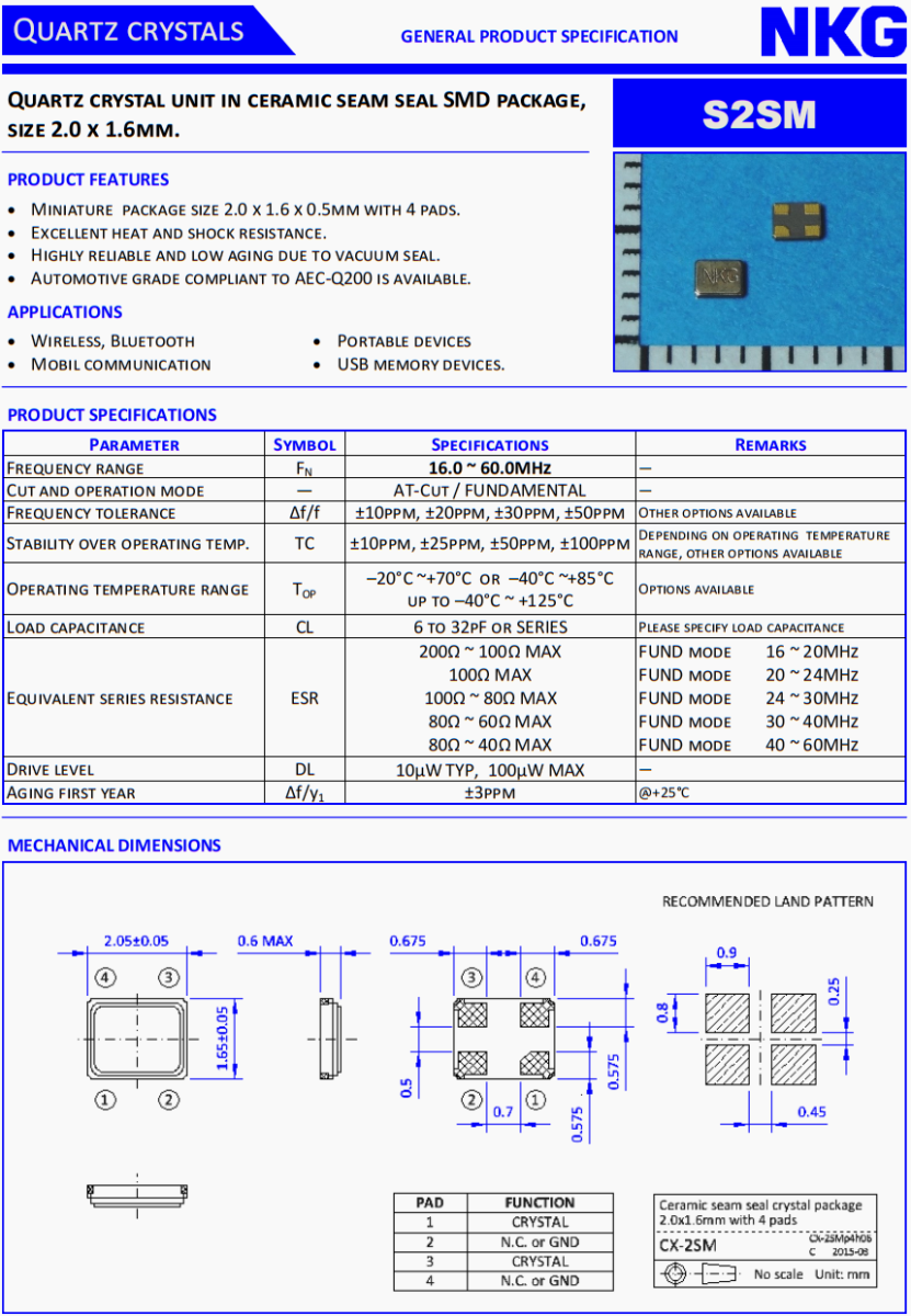 NKG超小型晶體,胎壓監(jiān)測裝置晶振,S2SM24.5760F12MYY-EXT貼片晶振,NKG晶振公司,無源晶振,貼片晶振,超小型晶振,2520晶振,液晶儀表盤晶振,石英晶振,耐高溫晶振,汽車多媒體設(shè)備晶振,6G通訊設(shè)備晶振,6G網(wǎng)絡(luò)終端晶振,無源晶振,貼片晶振。石英晶體單元在陶瓷縫密封SMD封裝,尺寸25. x 2.0mm。產(chǎn)品特點(diǎn):微型包裝尺寸2.5 x 2.0 x 0.5mm,有4個(gè)襯墊。優(yōu)異的耐熱性和抗震性。真空密封,可靠性高,老化率低。符合AEC-Q200標(biāo)準(zhǔn)的汽車級產(chǎn)品可供選擇。應(yīng)用范圍:無線、藍(lán)牙、移動(dòng)通訊、便攜設(shè)備、USB存儲設(shè)備