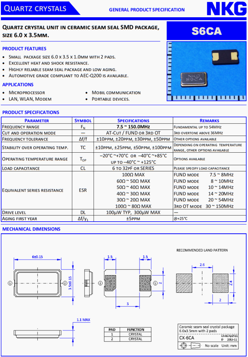 NKG二腳晶振,智能穿戴設(shè)備晶振,S6CA128.8800F18EYY-EXT四腳晶振。NKG晶振公司,無線傳輸晶振,汽車藍(lán)牙晶振,移動(dòng)通訊晶振,石英晶振,高品質(zhì)晶振,低損耗晶振,汽車級(jí)晶振,車載音響系統(tǒng)晶振,便攜設(shè)備晶振,USB存儲(chǔ)設(shè)備晶振。6035晶振,小體積晶振,超薄晶振,貼片晶振,進(jìn)口晶振,石英晶體單元在陶瓷縫密封SMD封裝,尺寸6.0 x 3.5mm。S6CA。產(chǎn)品特點(diǎn):小包裝尺寸6.0 x 3.5 x 1.0mm與2個(gè)墊。優(yōu)異的耐熱性和抗震性。高可靠的縫封封裝,低老化。符合AEC-Q200標(biāo)準(zhǔn)的汽車級(jí)產(chǎn)品可供選擇。應(yīng)用:微處理器,局域網(wǎng),無線局域網(wǎng),調(diào)制解調(diào)器,移動(dòng)通信,便攜式設(shè)備。
