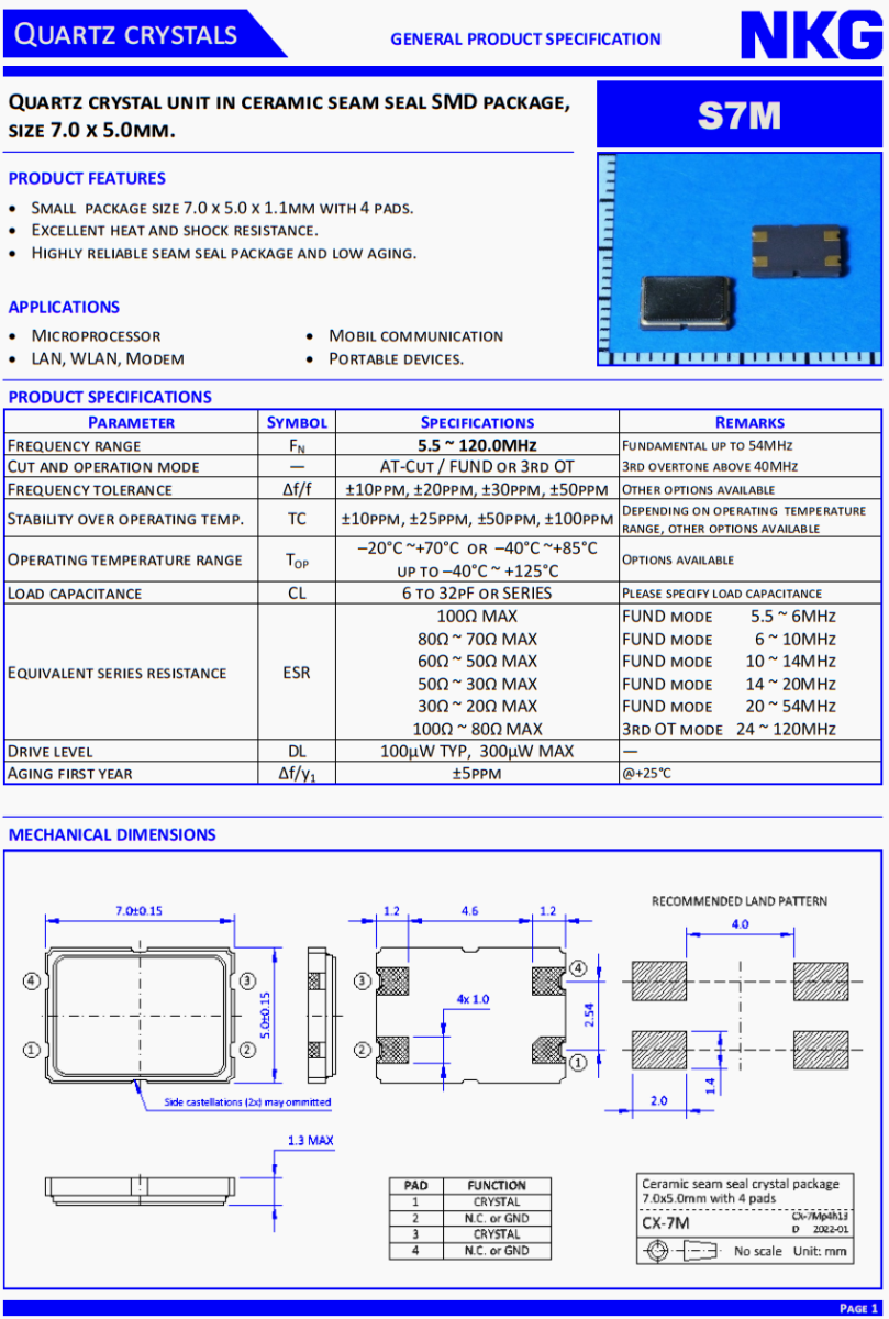 NKG7050晶振,S7M120.0000F18MYY-EXT晶振,車載氛圍燈晶振,。NKG晶振公司,無線傳輸晶振,汽車藍(lán)牙晶振,移動(dòng)通訊晶振,石英晶振,石英晶體單元在陶瓷縫密封SMD封裝,尺寸7.0 x 5.0mm。S7M。產(chǎn)品特點(diǎn):小包裝尺寸7.0 x 5.0 x 1.1mm, 4個(gè)襯墊。優(yōu)異的耐熱性和抗震性。高可靠的縫封封裝,低老化。應(yīng)用:微處理器,局域網(wǎng),無線局域網(wǎng),調(diào)制解調(diào)器,移動(dòng)通信,便攜式設(shè)備。高品質(zhì)晶振,低損耗晶振,汽車級(jí)晶振,車載音響系統(tǒng)晶振,便攜設(shè)備晶振,USB存儲(chǔ)設(shè)備晶振。4025晶振,小體積晶振,超薄晶振,貼片晶振,進(jìn)口晶振,