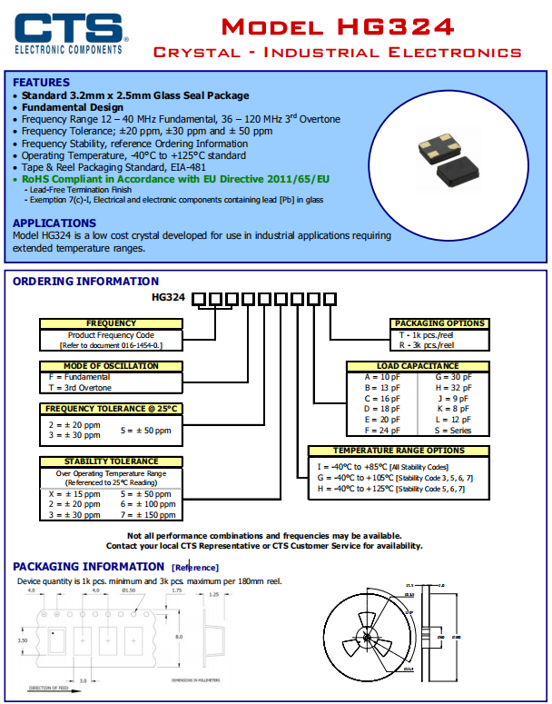 HG324240F23GCT晶振就是CTS晶振公司為需要擴展溫度范圍的工業應用開發的一款型號為HG324的無源晶振,石英晶體,尺寸3.2*2.5mm,頻率范圍12·120MHz,工作溫度可以選-40~125°C,-40~105°C,-40~85°C,頻率穩定性強,體積小,耐熱性好,是一種低成本的SMD石英晶體,由于它用途廣泛,一經上市,就受到了廣大客戶群體的喜歡。