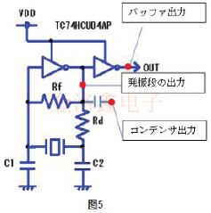 設計振蕩器電路時,有必要認識到各個組件的作用.因此,表1中以振蕩電路(圖1)為例,以通用C-MOSIC(東芝74HCU04AP)為例說明了每個電路的作用.