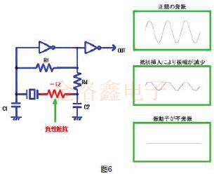 這是為了確認晶振振蕩電路具有多少振蕩余量,并且根據所獲得的值來預測振蕩穩定性的測量.如圖6所示,如果將一個電阻器(R)與振動器串聯,并且該值增大,則振動器將不會在某個電阻值以上振蕩.即將停止振蕩之前的電阻值為負電阻值.