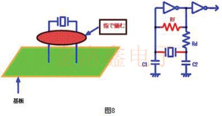 在要使用的振蕩電路中,檢查振蕩器是否可能以正常振蕩模式以外的其他模式振蕩.確定換能器的振蕩模式為基本模式時,確認高振蕩模式(從基本振蕩到第三階諧波的容易性)的簡單方法如圖9所示.2),示波器的波形為3.如果沒有泛音振蕩,則可以判斷為沒有異常振蕩的可能性.相反,示波器波形為3.如果發生泛音振蕩,則可以確定存在異常振蕩的可能性.用浸水的手指檢查的原因是在換能器端子之間形成一個小的電阻,并在圖8的電路圖中減小Rf以便于在高頻范圍內振蕩.