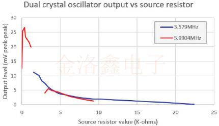 紅線是5.9904MHz,藍(lán)線是3.579MHz.在較低的電阻值下,您可以清楚地看到5.9904MHz晶體振蕩.高于1.5K時,將接管3.579MHz晶體.從大約3K到10K,兩個晶體同時振蕩.這兩個頻率的水平令人驚訝地相似.高于10K時,僅3.579MHz晶體振蕩.