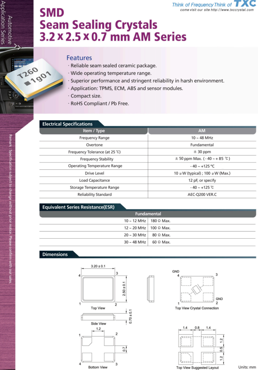 AM-48.000MAGE-T晶振,臺灣晶技晶振,汽車藍牙模塊晶振,臺灣TXC晶振,AM-48.000MAGE-T晶振,3225晶振,寬溫,汽車級晶振,無源晶振,無源晶振,石英晶體諧振器,四腳貼片晶振,超小型晶振,小型汽車晶振,車載收音機晶振,實時時鐘晶振,藍牙模塊晶振.特點可靠的縫密封陶瓷封裝。.工作溫度范圍寬。惡劣環境下的卓越性能和嚴格的可靠性應用領域: TPMS,ECM,ABS和傳感器模塊。體積小巧。符合RoHS標準/不含Pb。AM系列貼片,接縫密封晶體,3.2 x2.5 x0.7毫米