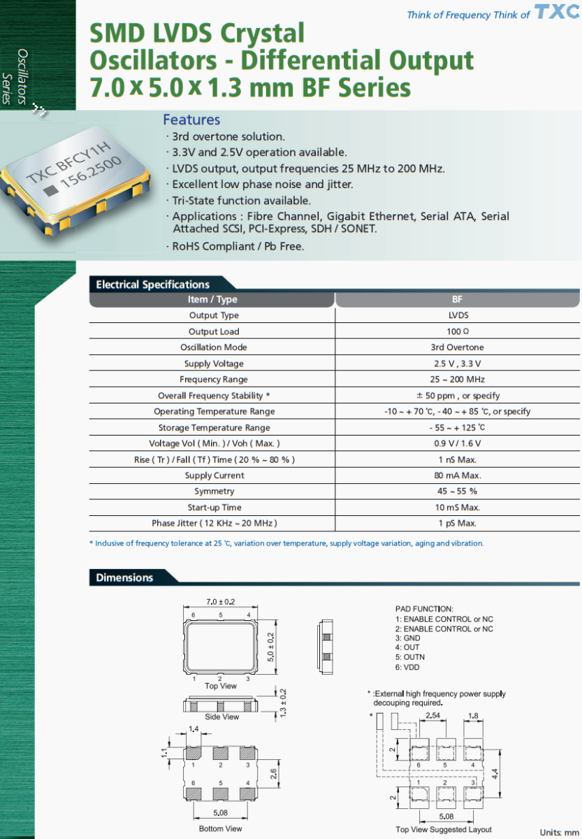 | BF-125.000MBE-T | TXC晶振 | BF | 125 MHz | LVDS | 3.3V | ±50ppm |