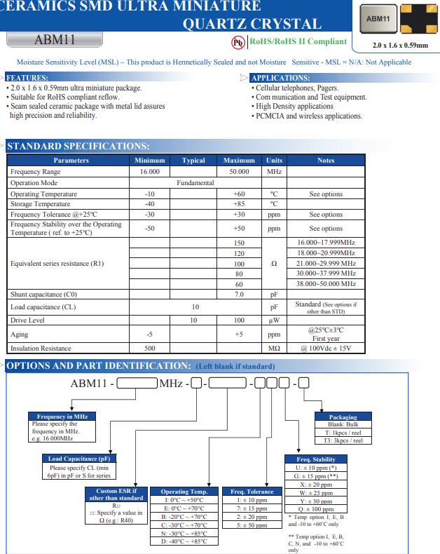 | ABM11-20.000MHZ-D2X-T3 | Abracon晶振 | ABM11 | MHz Crystal | 20MHz | 4-SMD, No Lead |
