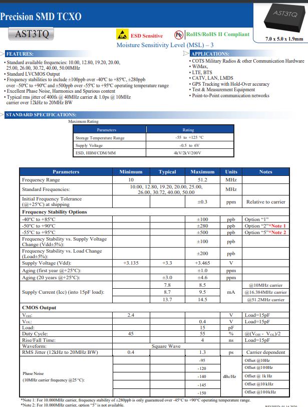 AST3TQ-20.00MHZ-5是一款封裝為7.0*5.0mm的溫補晶振,頻率20MHZ,電壓3.3V,輸出LVCMOS,標準可用頻率:10.00,12.80,19.20,20.00,25.00, 26.00, 30.72, 40.00, 50.00MHz,標準LVCMOS輸出,頻率穩定性包括-40ºC到+85ºC的±100ppb,±280ppb,超過-50ºC至+90ºC和±500ppb超過-55ºC至+95ºC的工作溫度范圍,良好的相位噪聲,諧波和雜散含量,典型的rms抖動400fs @ 40MHz載波和1.0ps @ 10MHz載波超過12kHz至20MHz BW.