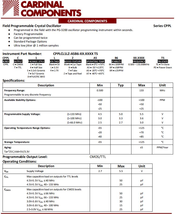 | CPPC7L-A7B6-50.0TS | Cardinal晶振 | OSC XO 50.000MHZ CMOS SMD | XO (Standard) | 50MHz | CMOS | ±100ppm | -40°C ~ 85°C |