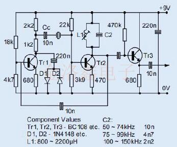 構成同相放大器的兩個接地發射極晶體管提供了必要的增益,以保證在這些頻率下晶體的低活動性時產生振蕩.L1和C2振蕩電路應進行調整以實現最大輸出,從而提供一定的選擇性并防止在錯誤的石英晶振模式下產生振蕩.二極管D1和D2將晶體驅動器限制在標準晶體的安全水平.為了進行精細的頻率調整,Cc可以是微調器,其中間值應近似等于平行校準晶體的負載電容. 構成同相放大器的兩個接地發射極晶體管提供了必要的增益,以保證在這些頻率下晶體的低活動性時產生振蕩.L1和C2振蕩電路應進行調整以實現最大輸出,從而提供一定的選擇性并防止在錯誤的晶振模式下產生振蕩.二極管D1和D2將晶體驅動器限制在標準晶體的安全水平.為了進行精細的頻率調整,Cc可以是微調器,其中間值應近似等于平行校準晶體的負載電容.