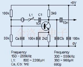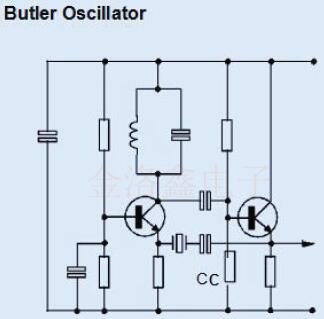 作為調諧振蕩器,巴特勒可用于高達100MHz的泛音晶體工作.但是,由于振蕩可能會通過晶體C0發生,因此建議使用一個較小的并聯電感器來消除這種振蕩.如果在振蕩電路的振蕩電路中放一個低阻抗抽頭,則可以省去發射極跟隨器.電路隨后變為接地振蕩器.要使用基本模式晶體工作,可以用一個電阻器代替LC儲罐.