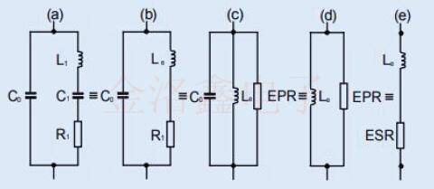 由于(Q)非常高,因此感抗與電阻之比很高,因此在(b)到(c)以及(d)到(e)的變換中,我們可以保持相同的電感值.我們可以說,”出于所有目的和目的”,與晶體并聯放置的負載電容器CL會以與晶體串聯的相同頻率(fL)與晶體諧振.因此,當我們留下高電阻值(EPR)或低電阻值(ESR)時,該頻率下的負載電流將與施加的電壓同相.