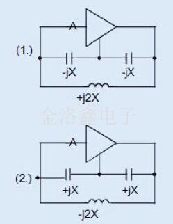 以上電路顯示了產生進一步相位反轉所需的反饋網絡.對于弧度的相移,網絡的要求是兩個串聯電抗的總和(不必相等)可以抵消第三個電抗.當兩個臂共振時會發生這種情況.圖(1)表示被稱為Pierce振蕩器的結構及其關系,即Colpitts和Clapp.圖(2.)代表Hartley和Miller.