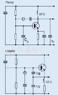 Pierce和Colpitts振蕩器的電路布置相似.電容器Ca和Cb與來自反饋網絡的晶體一起分別連接在相同的晶體管電極之間.兩個振蕩器的設計方程式相同,只是在哪個晶體管電極接地方面有所不同.