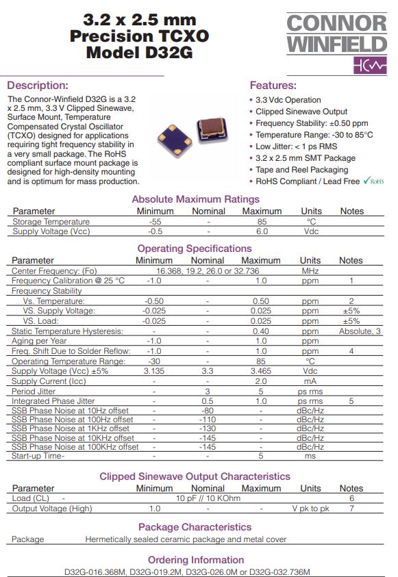 | D32G-019.2M | Connor-Winfield | D32G | 19.2MHz | -30°C ~ 85°C |