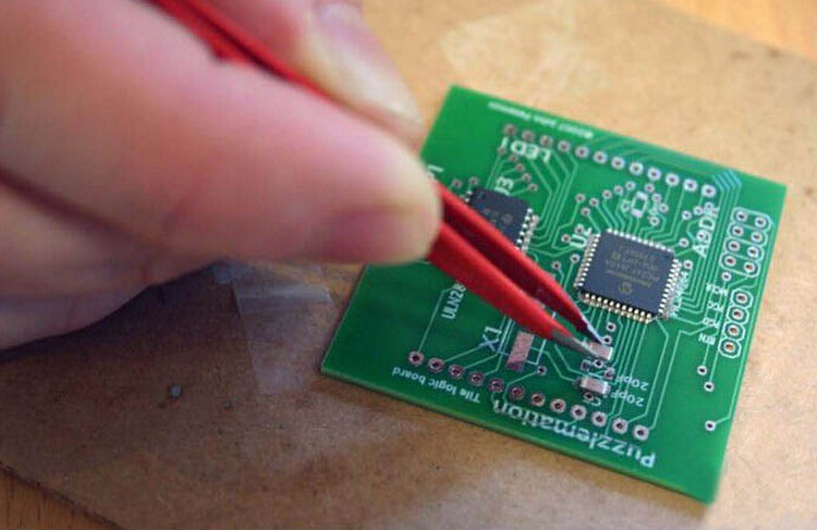 根據(jù)晶振引腳間距,選用圓錐形或鑿子形烙鐵頭,在焊盤上鍍上適量的焊錫,注意不要讓焊盤相互之間短路;用鑷子夾持貼片晶振,居中貼放在相應(yīng)的焊盤上,校準(zhǔn)極性和方向,使引腳與焊盤一一對(duì)齊。