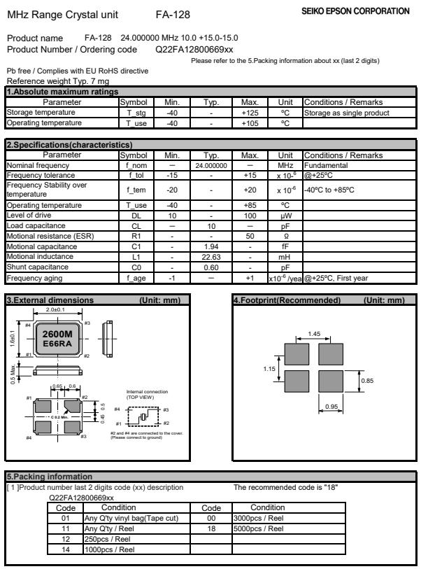 | Q22FA1280069200 | 2 x 1.6 x 0.5mm | FA-128 | 24.000000 MHz | 18 pF | +/-30 ppm |