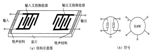 聲表濾波器的結構示意圖及符號如圖1所示。聲表濾波器有輸入叉指換能器和輸出叉指換能器。當輸入叉指換能器接上交流電壓信號時,壓電晶體基片的表面就產生振動,并激發出與外加信號同頻率的聲波,此聲波主要沒著基片的表面的與叉指電極升起的方向傳播,其中一個方向的聲波被除數吸聲材料吸收,別一方向的聲波則傳送到輸出叉指換能器,被轉換為電信號輸出。