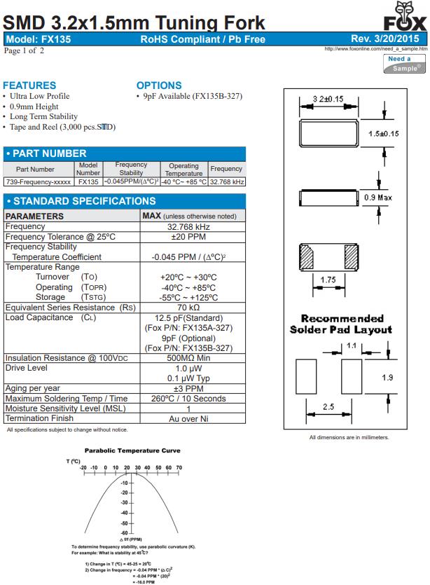 | X1A000161000500 | 3.2 x 1.5 x 0.9 mm | FC-135R | 32.768kHz | 7 pF | +/-20.0 ppm | -40 to +85 °C | +25ºC +/-5ºC | -0.04 x 10^-6/°C² | +/-3 ppm | Au |