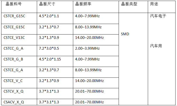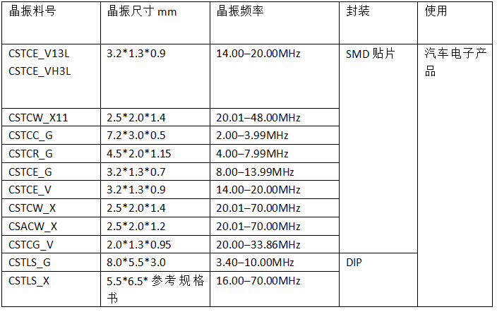 對(duì)于陶瓷晶振大家應(yīng)該不陌生,通常我們?cè)谵k公室看到的電話(huà)座機(jī)就會(huì)使用到陶瓷晶振,還有家有的遙控電路模塊也會(huì)使用到ZTT(三腳)和(ZTA)兩腳陶瓷晶振。那么接下就是給大家盤(pán)點(diǎn)一些汽車(chē)專(zhuān)用的村田貼片晶振與插件晶振的參數(shù),需要的可以拿個(gè)小本本記下來(lái)哦 村田晶振配備內(nèi)藏負(fù)載電容器的緊湊封裝型片狀“CERALOCK(陶瓷振動(dòng)子)”可保證極高的精確度,頻率的調(diào)整和表面封裝專(zhuān)有的技術(shù),實(shí)現(xiàn)了負(fù)載電容器內(nèi)藏片狀“CERALOCK”,振蕩電路無(wú)需任何外部連接負(fù)載電容器,內(nèi)部采用了村田先進(jìn)技術(shù)添加的內(nèi)部負(fù)荷電容,適用溫度低溫可到-40℃至120℃符合現(xiàn)實(shí)汽車(chē)內(nèi)置的高溫環(huán)境正常工作,產(chǎn)品具有外觀尺寸小,超薄,很適合汽車(chē)電子防盜遙控等小型產(chǎn)品應(yīng)用。