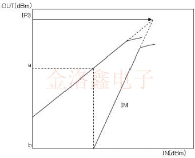 主信號輸出電平和互調輸出電平的直線相交的點稱為三階交調點(IP3).實際上,它會飽和到一定的水平,因此線條不會彼此相交,而要點是,直線區域不會按原樣飽和,如果水平升高,則會相交.
