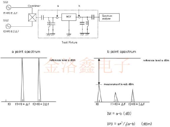 說明濾波器的重要特性——互調制.手機、電視、收音機等接收電波的設備,除了希望的電波外,其他強大的電波也同時到來.此時,電路中如果有非線性(輸出與輸入不成比例),就會發生互調這種有害現象.線性時,電路的輸出波用輸入波的一次函數表示,非線性時,會產生次數高的項,其中次數為奇數的項會發生互調(次數為偶數的項稱為高次諧波). 互調與三階交調點之間的關系: