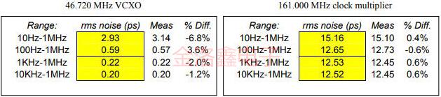 相位噪聲測試系統沿對數標度繪制頻率,每十年至少應選擇3個點.例如,為了獲得均勻分布的點,我們選擇使用10、20、50、100、200…等方法.點越多,相關性越好.剩下的就是取求和的平方根,然后除以(2*PI*Fo).我們已經描述了使此任務輕松實現以電子表格實現或將其編碼為BASIC或C程序所需的所有步驟,下面列出了以下結果,將該方法與Aeroflex PN9000相噪測試儀進行了比較,使用n=16點10Hz至1MHz. [供應商與客戶之間抖動抖動的相關性]