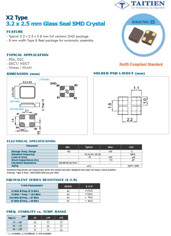 | X2AEECNANF-24.000000 | Taitien晶振 | X2 | 24MHz | -20°C ~ 70°C | 0.126" L x 0.098" W (3.20mm x 2.50mm) |