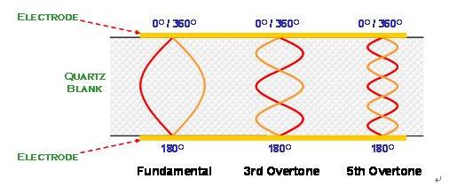 在AT切割角度的石英晶體共振子主要是以厚度剪切振蕩模態存在.石英晶振在共振時, 除了基本波振蕩之外, 高階的倍頻共振也與基本波振蕩同時存在于石英晶體的電極區域之間. 但是, 由于壓電材料的電極是電氣相位相反的振動環境, 所以, 祇有奇數倍(odd number)的高頻倍頻可以發生,偶數倍(even number)的倍頻共振在石英晶體共振子是不會存在的.