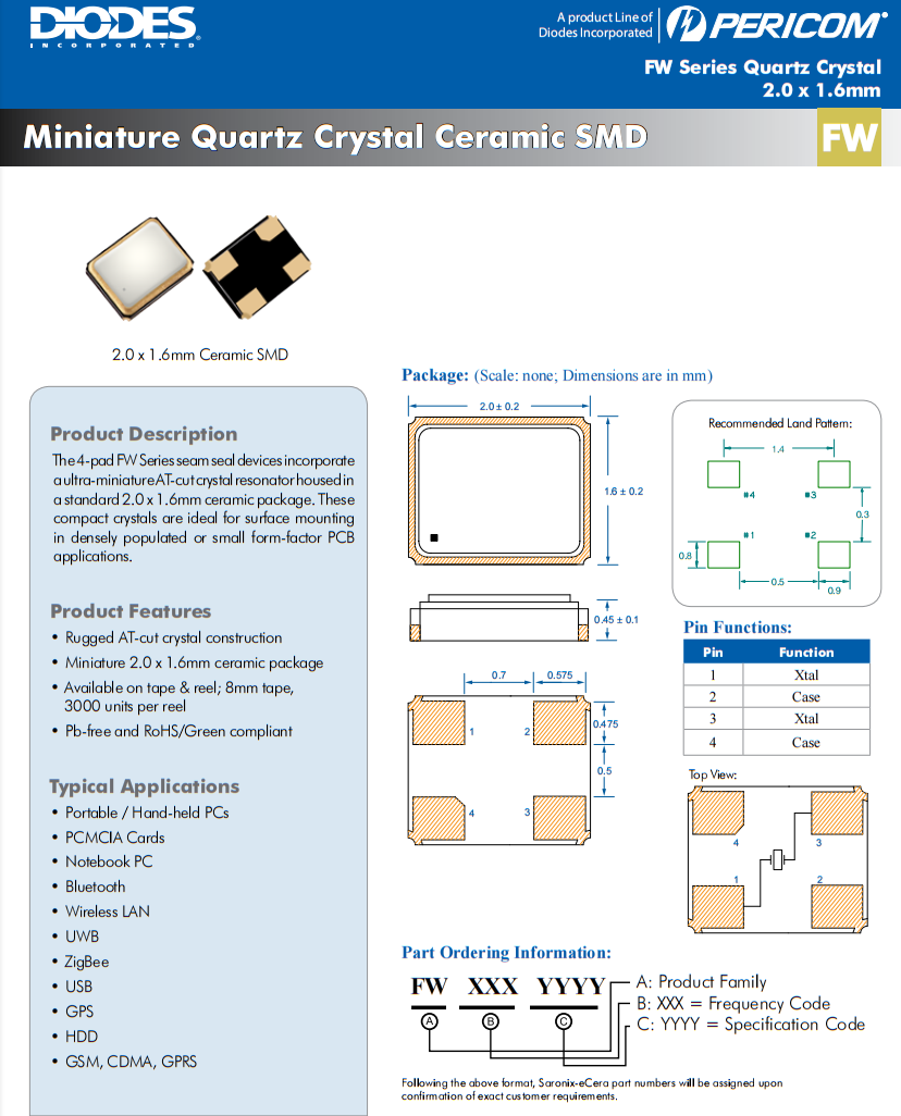 | FW1920001 | Diodes 晶振 | FW | 19.2 MHz | ±20ppm | ±10ppm | 8pF |